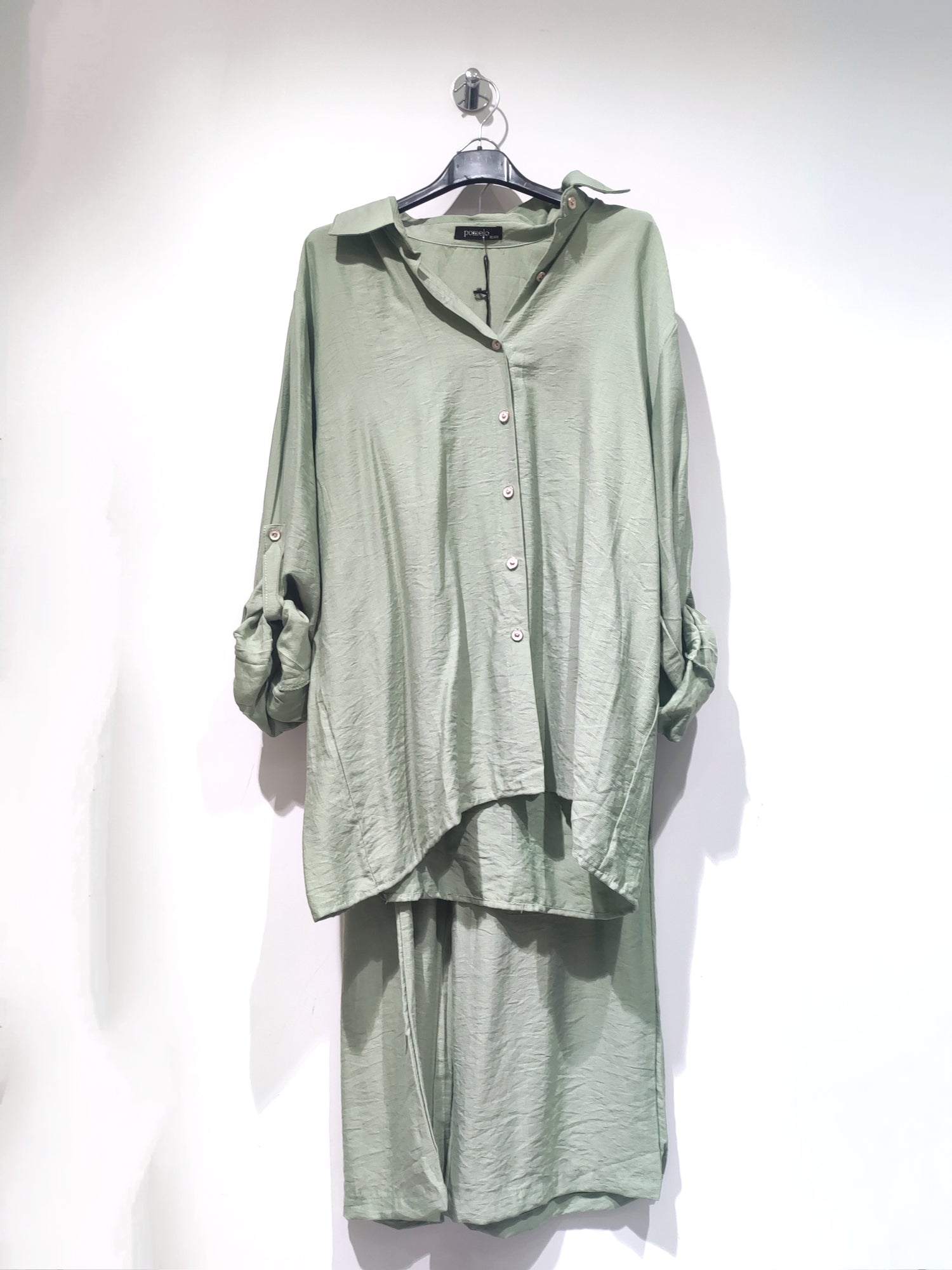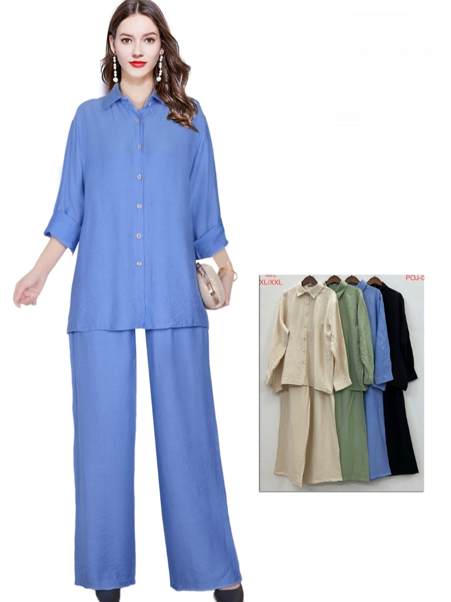 La chemise, à la coupe droite et au col classique, se porte facilement rentrée ou laissée lâche pour un look plus décontracté. Le pantalon à jambes larges offre une silhouette élégante tout en garantissant une grande liberté de mouvement.