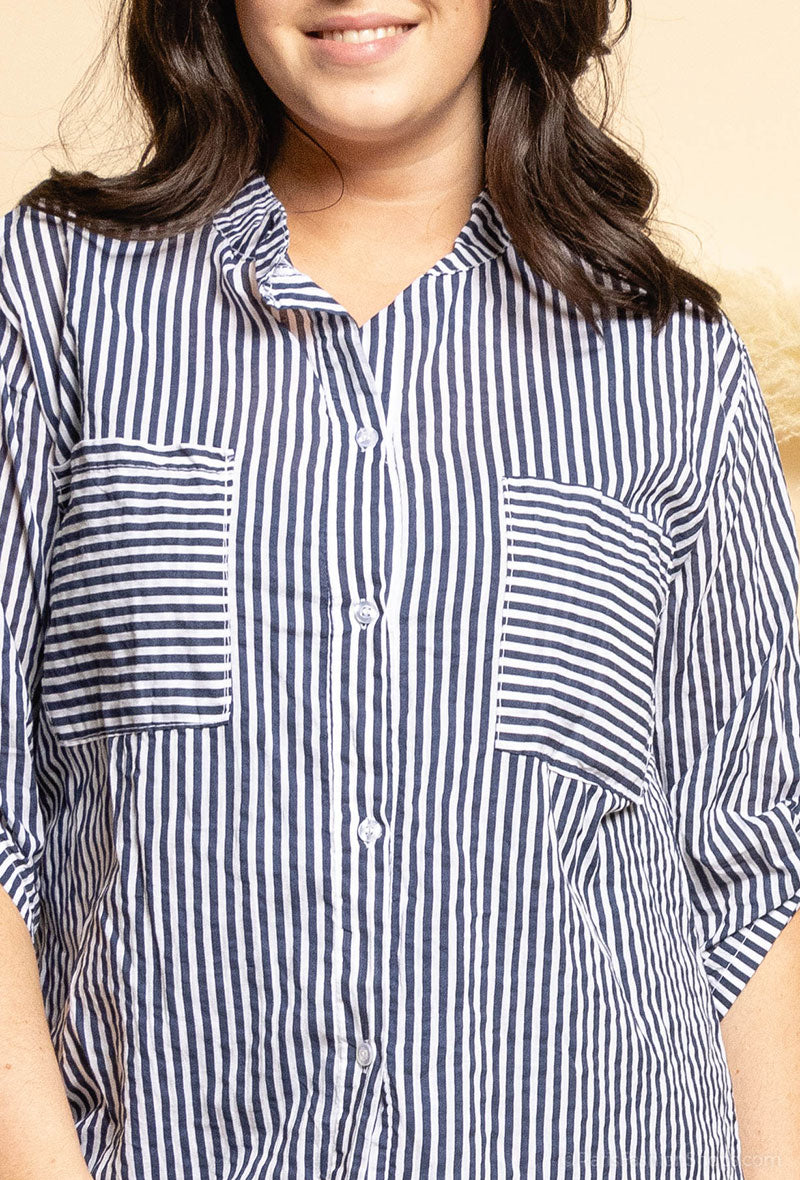 Chemise longue rayée, col mao, deux poches; Longueur pour toutes les tailles : 95 centimètres environ Tour de poitrine maximum : 120 centimètres Tour de hanches maximum : 126 centimètres. Peut habiller de la taille 42 à 46; La mannequin mesure 170cm et fait du 44-46.