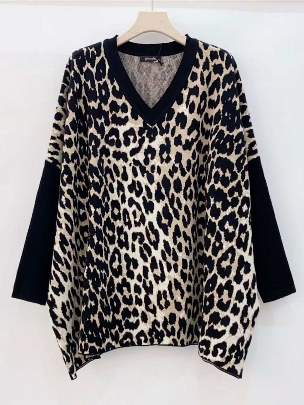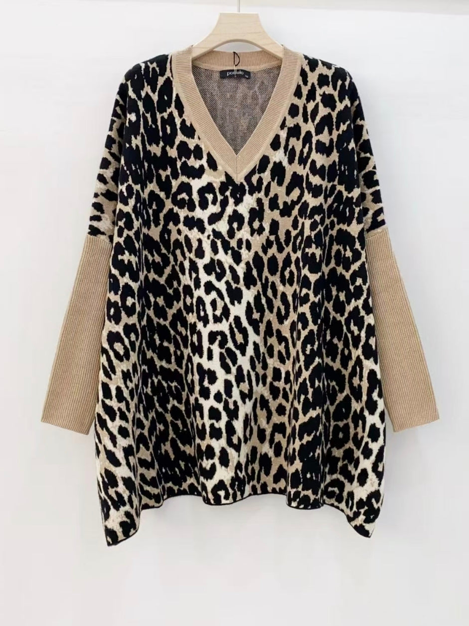 Tunique imprimé en maille doux et chaud, coupe ample, col v et manche longue. Longueur pour toutes les tailles : 75 centimètres environ. Tour de poitrine maximum : 140 centimètres. Peut habiller de la taille 46 à 56