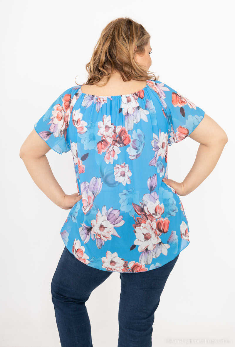 Blouse manche court à col élastique avec lien, motifs fleury, taille élastique; Longueur : 65 centimètres environ Tour de poitrine maximum: 110 centimètres . Peut habiller de la taille 36 à 42.